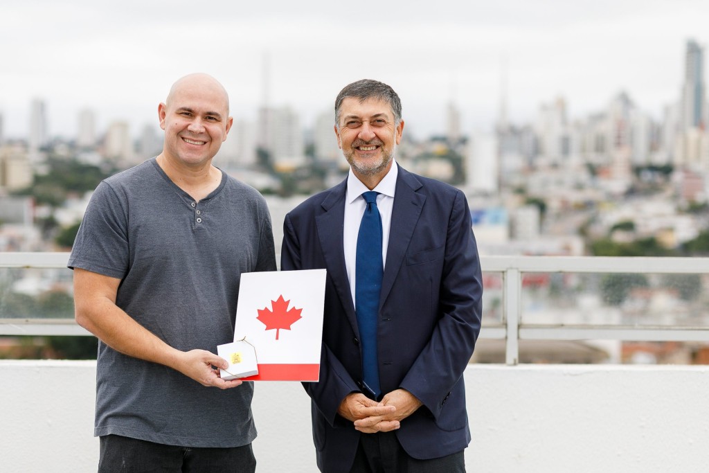Imagem mostra o prefeito Abilio Brunini e o embaixador do Canadá no mirante no terraço do Palácio Alencastro, num momento descontraído em que trocam presentes.