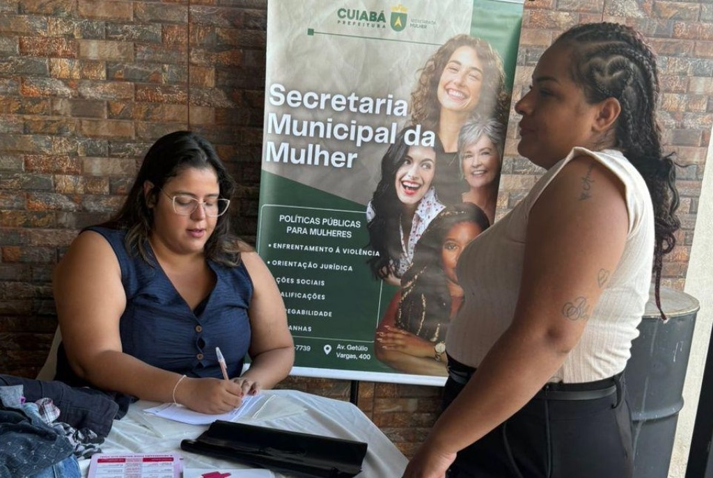 A foto mostra o atendimento da Secretaria da Mulher em Ação nos bairros de Cuiabá.