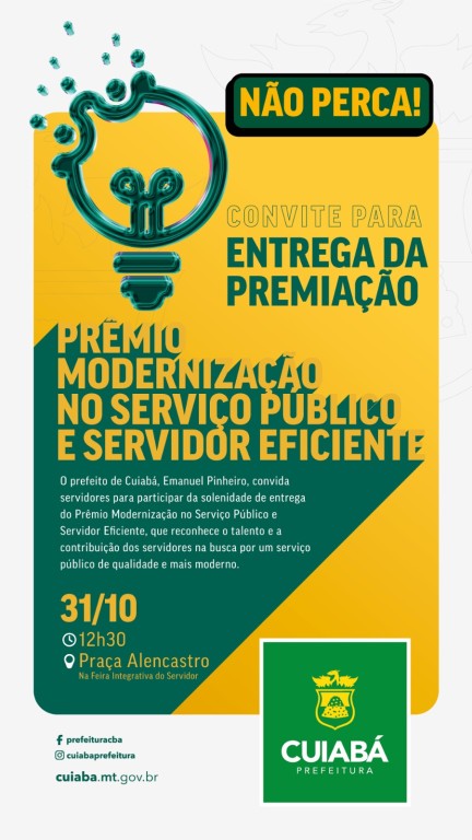 Às 12h, o prefeito de Cuiabá, Emanuel Pinheiro, realizará o anúncio dos vencedores dos Prêmios Modernização e Servidor Eficiente, com a entrega das premiações: um carro zero quilômetro para o primeiro lugar, um iPhone 15 para o segundo e um pacote de viagem no valor de até R$ 5 mil para o terceiro colocado. Além disso, todos os finalistas receberão um subsídio extra.