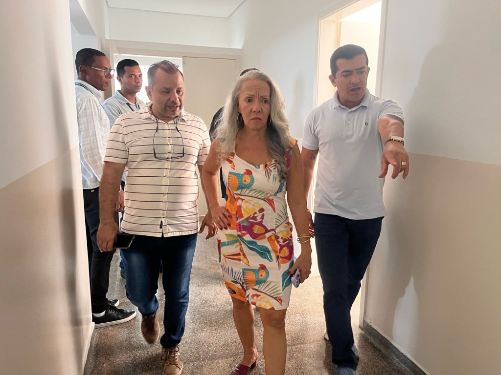 A imagem mostra a secretária de Saúde juntamente com o deputado Elizeu Nascimento durante uma visita a duas unidades de saúde que se encontram com as obras paralisadas. Na foto, a chefe da pasta aparece à frente, usando um vestido florido, enquanto o deputado caminha ao lado dela, acompanhado de outros servidores.
