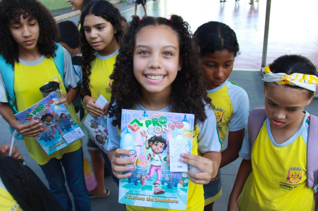 “Entregamos a nossa revistinha personalizada da Dandara, que é a nossa mascote do Procon Municipal, que conta a historinha de uma situação que a Dandara passou no mercado. É justamente isso que trazemos para a escola: o mercado para simbolizar toda essa prática”, explicou Samira Gomes, que é gerente do cartório do Procon.