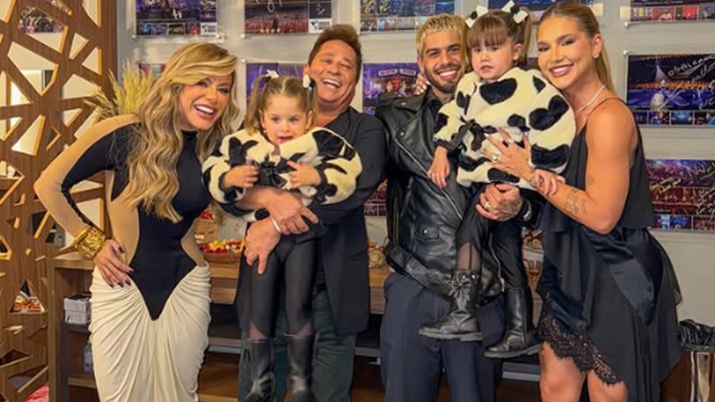 Virginia Fonseca, de 26 anos, aproveitou a noite de quinta-feira (22), ao lado da família durante a gravação do DVD Uma História Sem Fim, do sogro Leonardo, em São Paulo. Acompanhada do marido, Zé Felipe, e das filhas Maria Alice e Maria Flor, posou sorridente com outros membros da família.