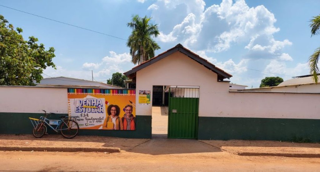 #PraTodosVerem – Imagem do portão de entrada da Escola Municipal Vila Tapiraguaia. A entrada é marcada por uma fachada simples, com um muro pintado de branco na parte superior e verde na parte inferior, e um pequeno telhado de cumeeira marrom no portal. À esquerda, um grande banner colorido com os dizeres “VENHA ESTUDAR” e uma chamada para EJA (Educação de Jovens e Adultos) e Ensino Fundamental está afixado no muro. O portão é feito de metal pintado de verde escuro e está semiaberto. Na frente do muro, à esquerda, há uma bicicleta de carga (carrinho de mão) estacionada.