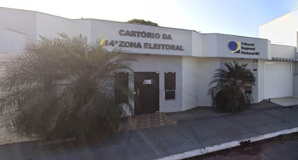 #PraTodosVerem – A imagem mostra a fachada de um prédio identificado como Cartório da 14ª Zona Eleitoral, vinculado ao Tribunal Regional Eleitoral de Mato Grosso (TRE-MT). A construção é simples, com paredes claras, portas escuras e algumas plantas ornamentais na entrada, transmitindo um ambiente institucional e organizado.