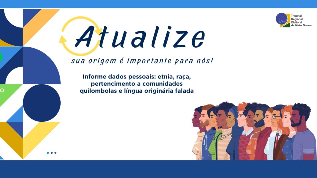 #PraTodosVerem: Sobre um fundo branco, observa-se uma faixa azul-clara no topo. No centro da imagem, em letras azuis, lê-se a mensagem: “Atualize sua origem, é importante para nós!”, com a letra “A” envolvida por um símbolo de atualização em amarelo. Abaixo, há um texto também em azul com a orientação: “Informe dados pessoais: etnia, raça, pertencimento a comunidades quilombolas e língua originária falada.” No canto superior direito, encontra-se o logotipo do Tribunal Regional Eleitoral de Mato Grosso. Na parte inferior, uma faixa azul-escura acompanha a base da imagem. No canto inferior direito, uma ilustração exibe pessoas com diversas características físicas, tons de pele, estilos de cabelo e trajes. No lado esquerdo, um padrão de formas geométricas em azul, verde, branco, amarelo e laranja complementa a composição.
