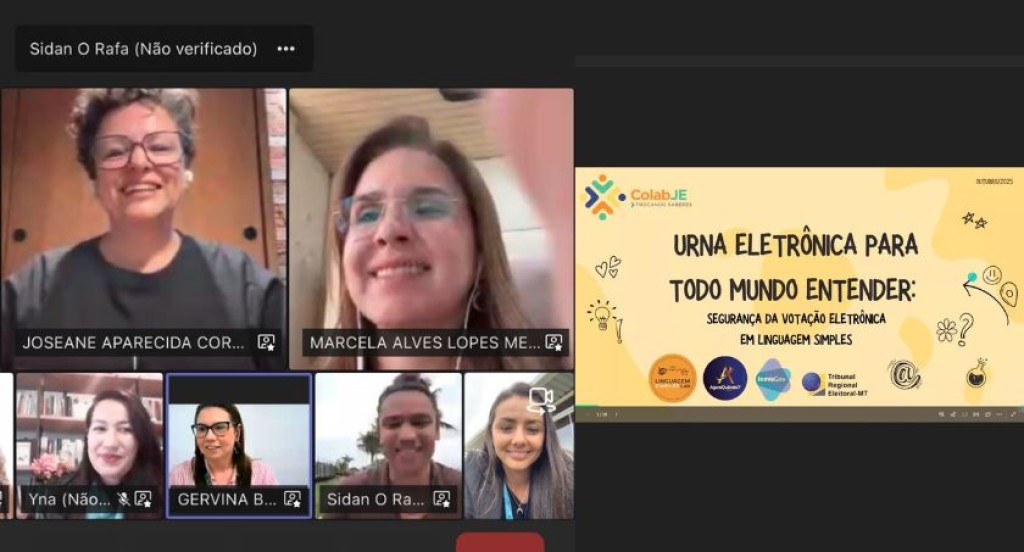 O projeto “Linguagem Simples e Democracia: como explicar a segurança das urnas eletrônicas”, desenvolvido em cooperação entre o Tribunal Regional Eleitoral de Mato Grosso (TRE-MT) e o Linguagem Simples Lab, foi apresentado na 16ª edição do Colab JE – Trocando Saberes, realizada na terça-feira (8 de outubro). O evento, promovido pelo Laboratório de Inovação da Justiça Eleitoral (LIODS-JE), reúne periodicamente integrantes da Justiça Eleitoral de todo o país para compartilhar práticas e experiências inovadoras.