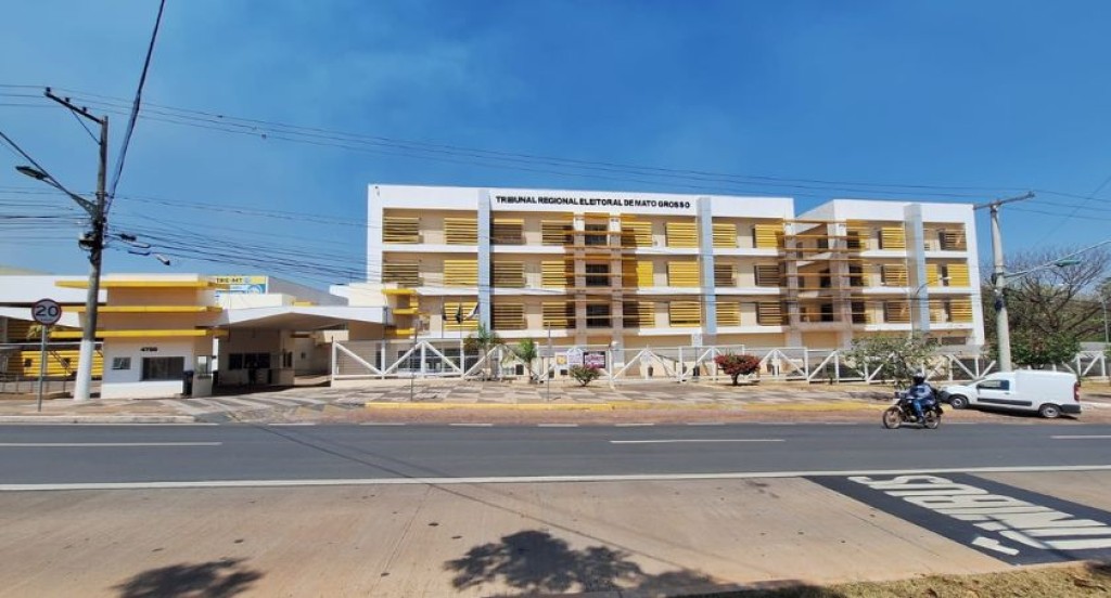 Descrição da Imagem – A imagem mostra a fachada do prédio do Tribunal Regional Eleitoral de Mato Grosso (TRE-MT), um edifício moderno de vários andares, pintado em branco e amarelo, com janelas dispostas em linhas regulares. Em frente, há uma avenida asfaltada, com faixa de pedestres, placas de sinalização e alguns veículos em circulação, transmitindo a ideia de organização e estrutura institucional.