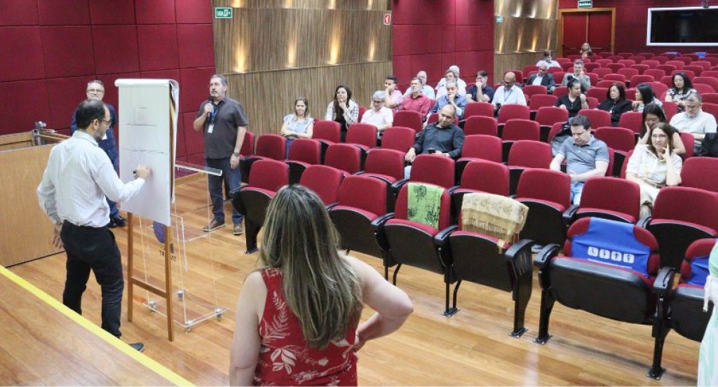 #PraTodosVerem: A imagem mostra um auditório com cadeiras vermelhas, onde um grupo de pessoas assiste a uma apresentação. Na frente, um homem escreve em um quadro branco enquanto outro fala ao microfone, e uma mulher observa de perto. O ambiente sugere a realização de uma capacitação, reunião ou atividade de treinamento, com participação ativa do público presente.