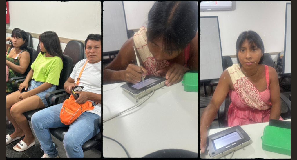 #PraTodosVerem: A imagem é composta por três quadros que retratam o atendimento de pessoas indígenas em um ambiente institucional relacionado à Justiça Eleitoral. No primeiro quadro, três mulheres e um homem aguardam sentados em uma sala de espera. No segundo, uma jovem indígena assina digitalmente em um equipamento de coleta de dados. No terceiro, a mesma jovem está sentada à frente do equipamento, olhando para a câmera. A sequência sugere o processo de cadastramento biométrico ou atualização de dados eleitorais.