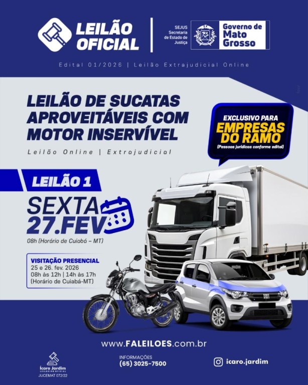 Começa nesta sexta-feira (27.2) o primeiro Leilão da Polícia Civil de Veículos e/ou Sucatas Aproveitáveis com Motor Inservível. Serão leiloados 335 veículos, que viraram sucatas e encontram-se acondicionados no pátio do setor de transporte da instituição, em Cuiabá.