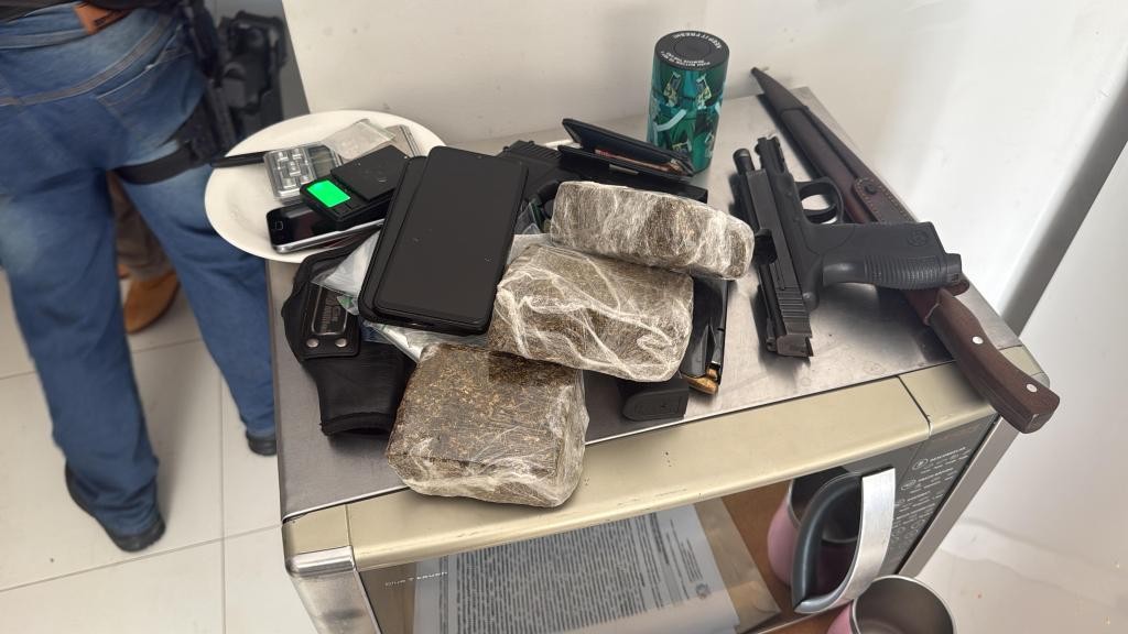 Além disso, foram apreendidos três aparelhos celulares; cigarros compostos por substância análoga à maconha; tabletes de maconha; vários invólucros tipo zip lock, utilizados para embalar entorpecentes e duas balanças de precisão para pesar drogas.