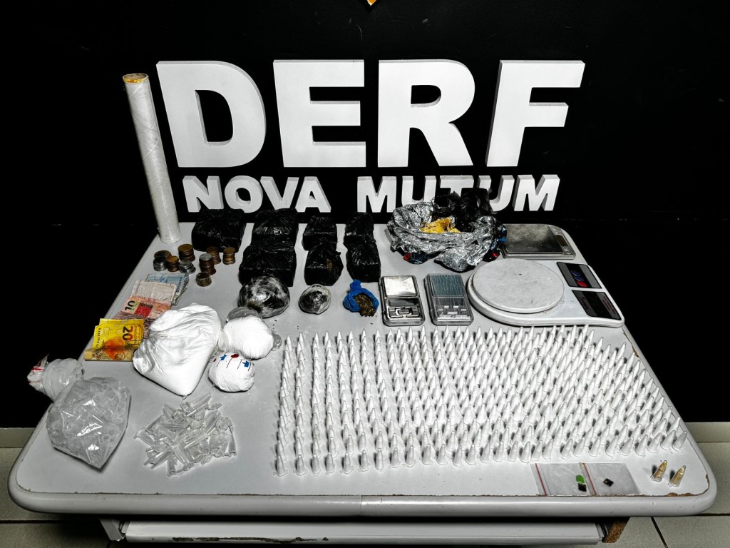 Já na residência do entregador, em Nova Mutum, foram apreendidas porções de maconha, haxixe, pasta base, cocaína, pinos eppendorf, LSD, além de balança de precisão, dinheiro, uma motocicleta e um veículo Toyota Corolla.