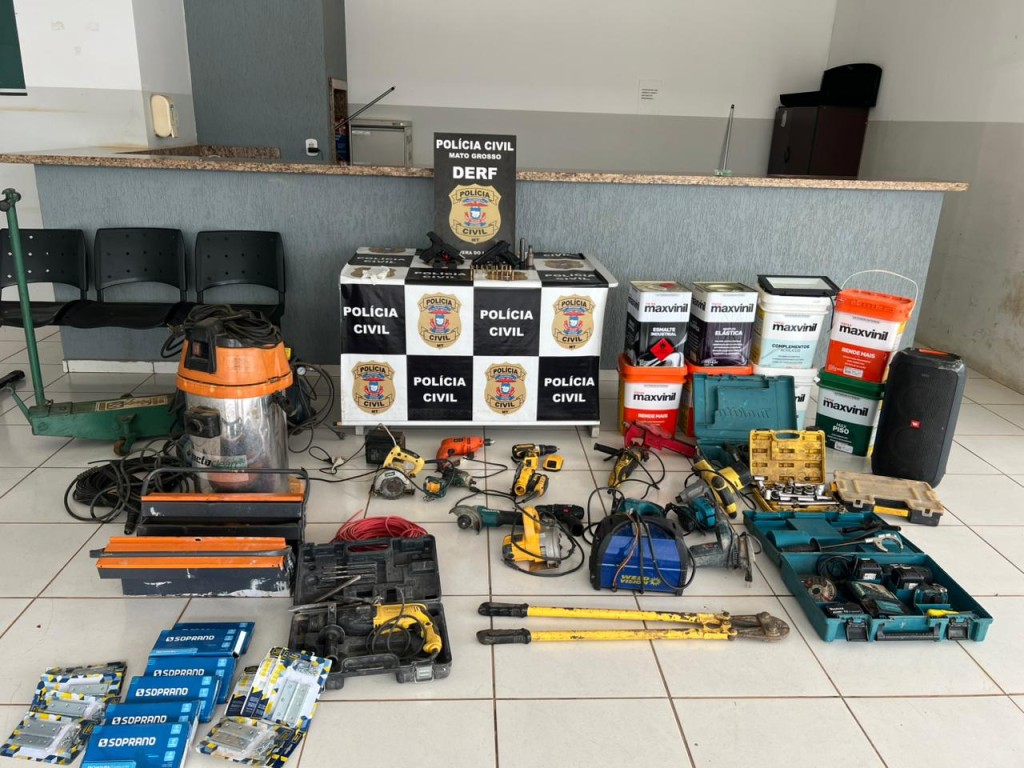 Entre os materiais encontrados na casa do suspeito estavam centenas de ferramentas para construção civil como maquita, serras, dobradiças, tinta, argamassa, fechaduras, esmalte sintético, parafusadeira, pistola de pressão, martelete, esmerilhadeira, transformador, lavadora de alta pressão, lixadeira, entre outros.