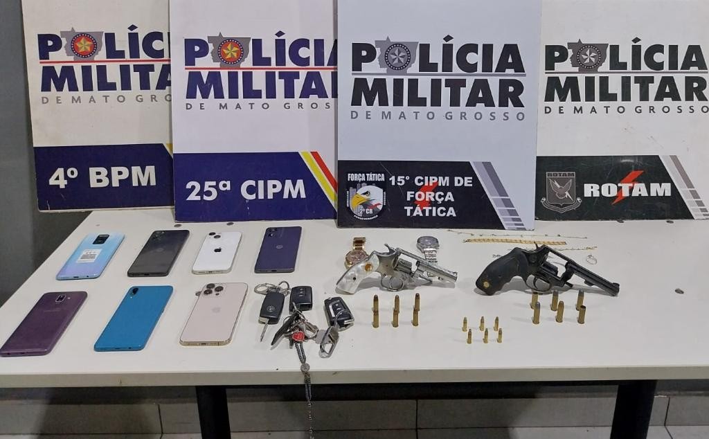 Policiais militares da Força Tática do 2º Comando Regional prenderam, nesta terça-feira (2.9), dois homens e três mulheres, suspeitos por roubo e porte ilegal de arma de fogo, em Várzea Grande. Na ação, as equipes recuperaram um veículo Toyota Corola prata, apreenderam um Fox, duas armas de fogo e munições. Os militares contaram com apoio do Ciopaer, 25ª Cia PM, 4º Batalhão e a Rotam.
