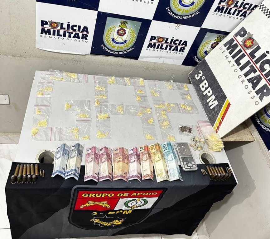 Com os suspeitos, foram encontradas 30 munições de calibres diferentes, 83 porções de drogas e R$ 255 em dinheiro.