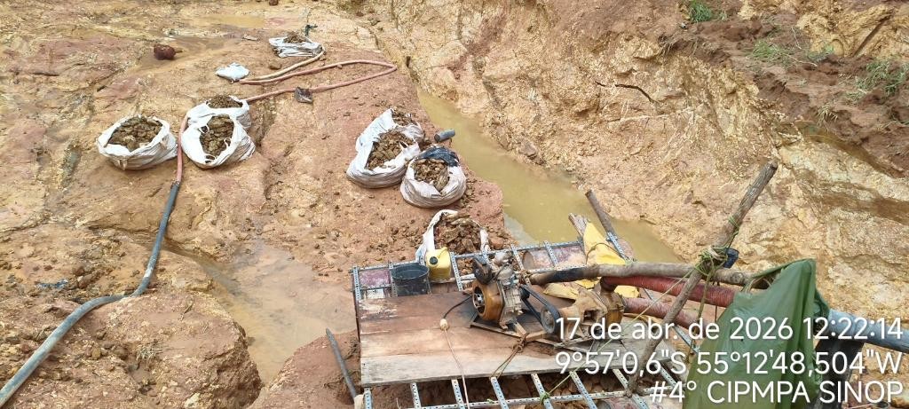 Ao chegarem na região, os militares flagraram um garimpo ilegal em pleno funcionamento, onde dois motores estacionários estavam acoplados em uma bomba de sucção. Além disso, os policiais também encontraram uma escavadeira, uma calha concentradora de minérios e dois contêineres de combustível.