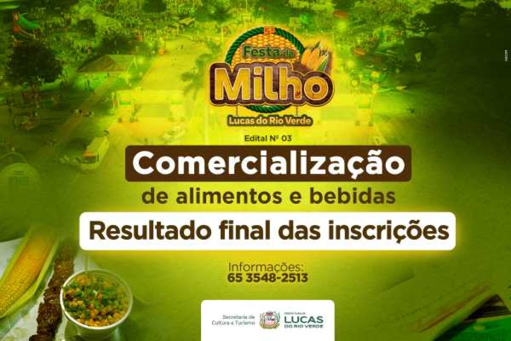 A Prefeitura de Lucas do Rio Verde, por meio da Secretaria de Cultura e Turismo, divulgou nesta quinta-feira (23) o resultado final do Edital de Seleção nº003/2026, que trata da comercialização de alimentos e bebidas na 5ª Festa do Milho. O evento será realizado nos dias 9 e 10 de maio, na rotatória do Paço Municipal.