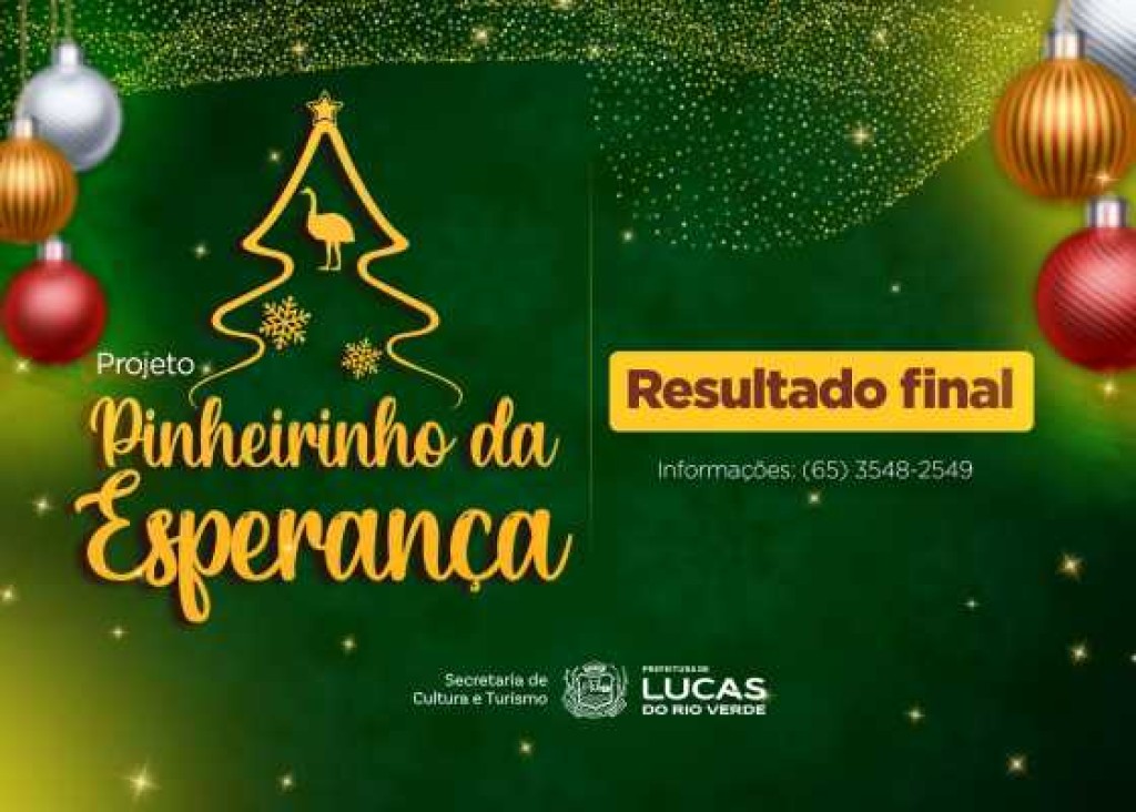A Prefeitura de Lucas do Rio Verde, por meio da Secretaria de Cultura e Turismo, torna pública a homologação das inscrições das empresas participantes do Edital nº 008/2025 – “Pinheirinho da Esperança”, que tem como objetivo selecionar estabelecimentos comerciais do município para a decoração de árvores natalinas, dentro da programação oficial do Natal da Esperança 2025.