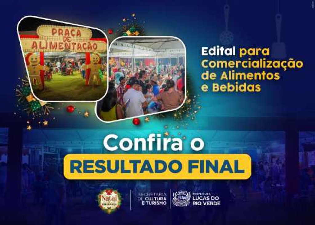 A Secretaria de Cultura e Turismo de Lucas do Rio Verde publicou, nesta terça-feira (26), o resultado final das inscrições do Edital de Seleção nº 001/2024, para a comercialização de alimentos e bebidas na Praça de Alimentação da 4ª Edição do Natal da Esperança.