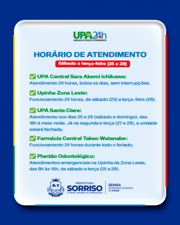 A UPA Sara Akemi Ichicava; a Farmácia Central Takeo Watanabe e o SAMU seguem com atendimento 24 horas, todos os dias. Para acionar o SAMU, é só chamar 192. As Upinhas também manterão a rotina de atendimento: A da Zona Leste terá atendimento nas 24 horas do dia na sexta-feira (1.º de maio), no sábado (2 de maio) e no domingo, (3 de maio); e a do Santa Clara atenderá das 18 horas à meia-noite na sexta.