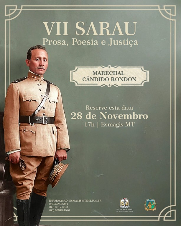 A sétima edição do Sarau Prosa, Poesia e Justiça, promovido pela Escola Superior da Magistratura de Mato Grosso (Esmagis-MT), será realizada no dia 28 de novembro, às 17h, nas dependências da Escola. Desta vez, o homenageado será o marechal Cândido Mariano da Silva Rondon.